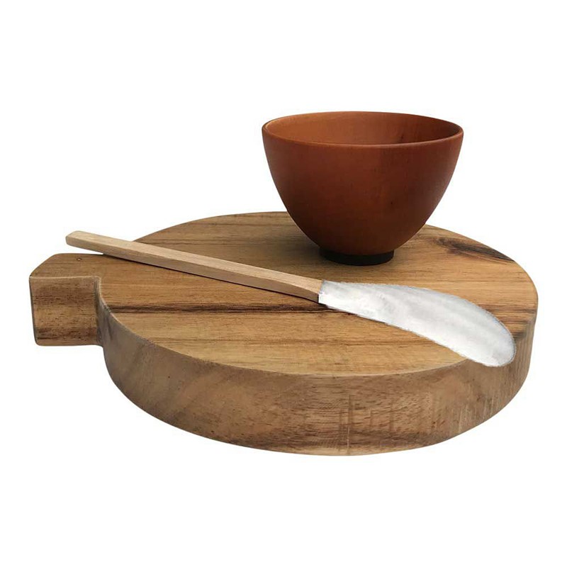 Deze snackset bestaat uit een houten schaaltje, een mesje van essenhout met hoorn en een acaciahouten plank.