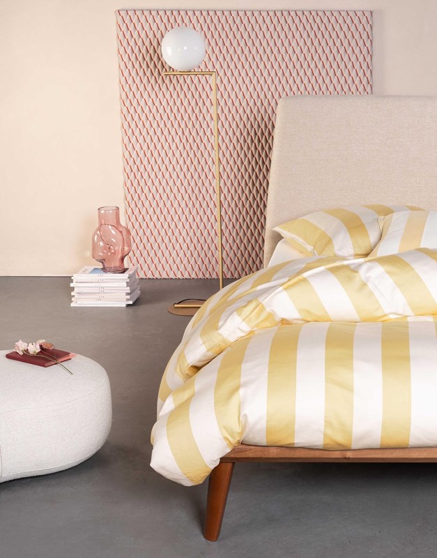 Wil je deze kleur toepassen zonder dat je woonkamer of slaapkamer in een smoothiebar verandert? Werk dan met lagen voor meer diepte. Begin bijvoorbeeld met sierkussens, een vaas of een zacht plaid. Of ga voor een mooi dekbedovertrek in de kleur Butter Yellow. Deze kleur komt het mooist tot zijn recht naast natuurlijke materialen. Licht eikenhout, linnen stoffen, travertin of natuursteen zorgen ervoor dat de kleur subtiel blijft en de sfeer warm en rustgevend aanvoelt. Een neutrale basis zoals off-white, zand of greige laat Butter Yellow subtiel spreken en houdt het interieur licht en in balans.