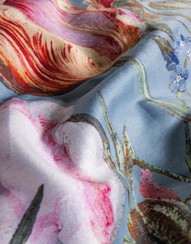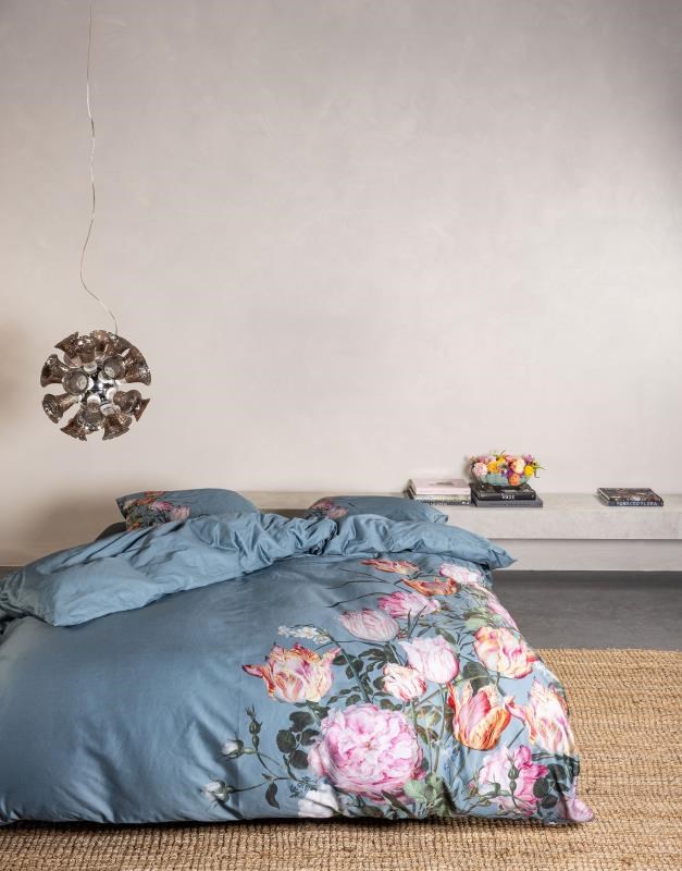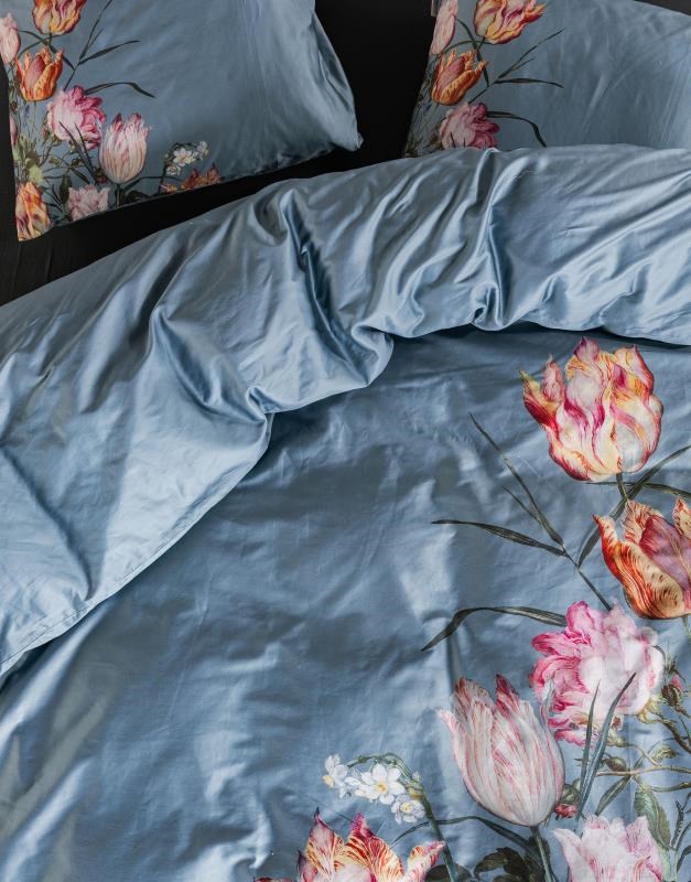 Het Essenza Painter’s Garden dekbedovertrek in denim brengt de sfeer van een klassiek bloemstilleven naar de slaapkamer, met een verfijnd en rustig ontwerp dat blijft boeien. Het dessin is geïnspireerd op historische bloemcomposities uit de schilderkunst, waarbij bloemen centraal staan als symbool van schoonheid en detail. Langs de randen van het overtrek bloeien elegante rozen en tulpen in zachte tinten zoals oudroze, perzik en zalmrood, die prachtig afsteken tegen de diepe blauwdenim achtergrond. Deze manier van plaatsen geeft het geheel een luchtige, bijna schilderachtige uitstraling en zorgt voor een mooi evenwicht tussen decoratief en sereen. Het dekbedovertrek is gemaakt van luxe katoen satijn, een stof die bekendstaat om haar zijdezachte gevoel, soepele valling en subtiele glans. Het materiaal ademt goed en voelt comfortabel aan, ongeacht het seizoen. De lichte glans versterkt de kleuren en geeft het overtrek een verfijnde, hoogwaardige uitstraling. Dankzij de extra lange instopstrook over de volledige breedte maak je het bed eenvoudig strak op, terwijl het dekbed netjes op zijn plek blijft.