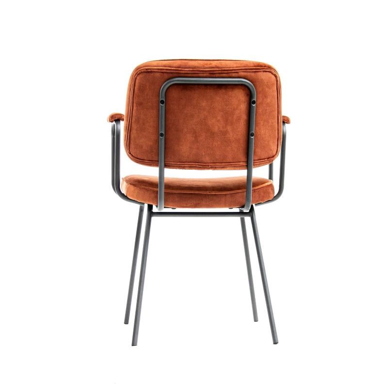 Armstoel Kim is voorzien van een fluweelzachte bekleding (100% polyester) en heeft een antraciet kleurig metalen onderstel.