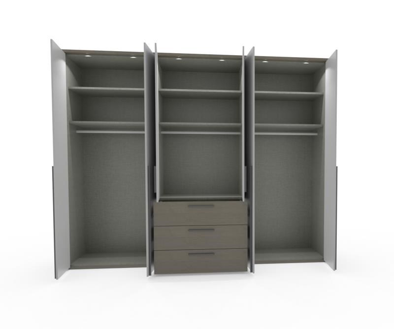 De getoonde luxe kledingkast heeft zes deuren en drie uittrekbare laden in het middelste gedeelte.